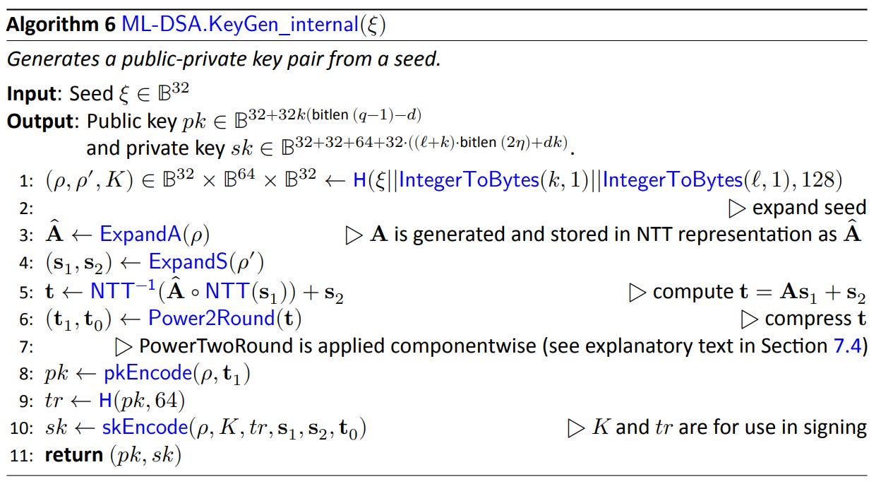 The screenshot below, extracted from [FIPS204], illustrates the key generation part of ML-DSA.