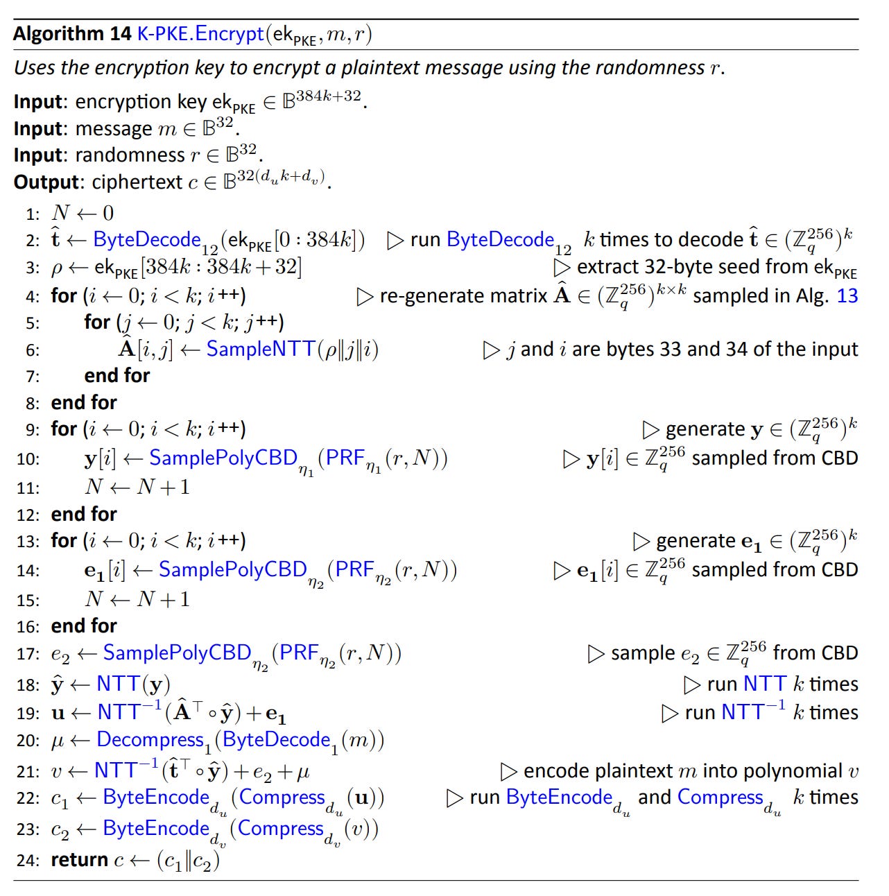 The screenshot below extracted from the [FIPS203] standard, illustrates the encryption algorithm of ML-KEM.