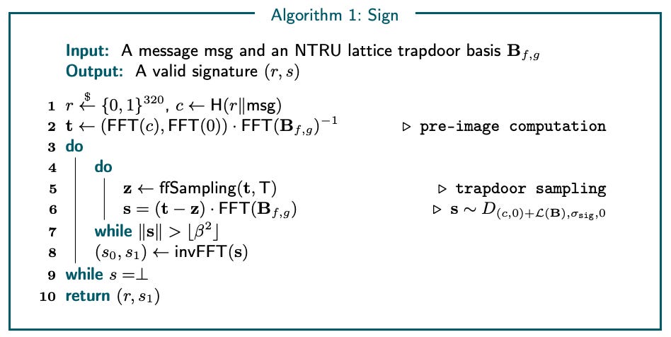 The screenshot below (extracted from [FALCON-ERR]) represents the signature algorithm of FN-DSA.