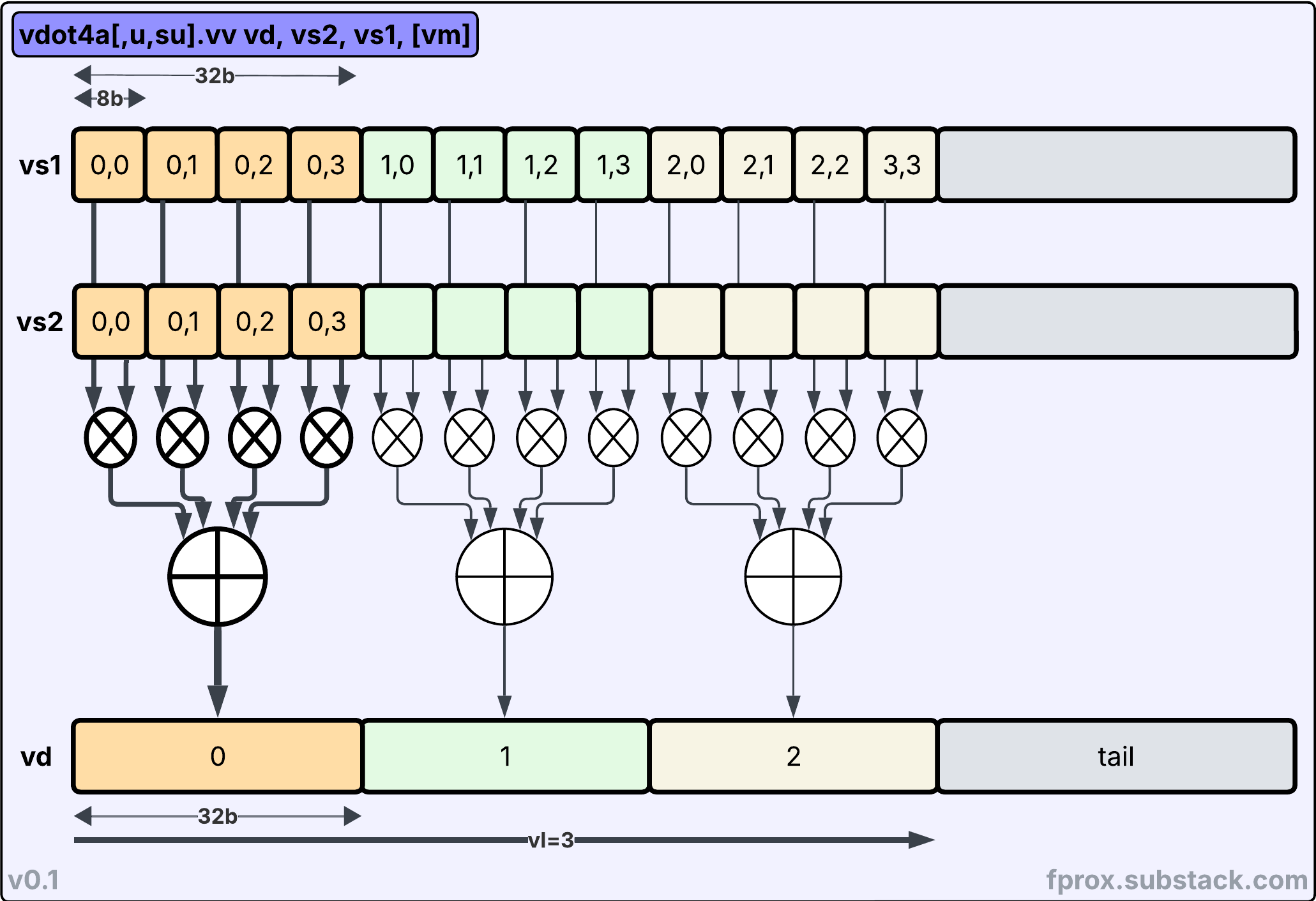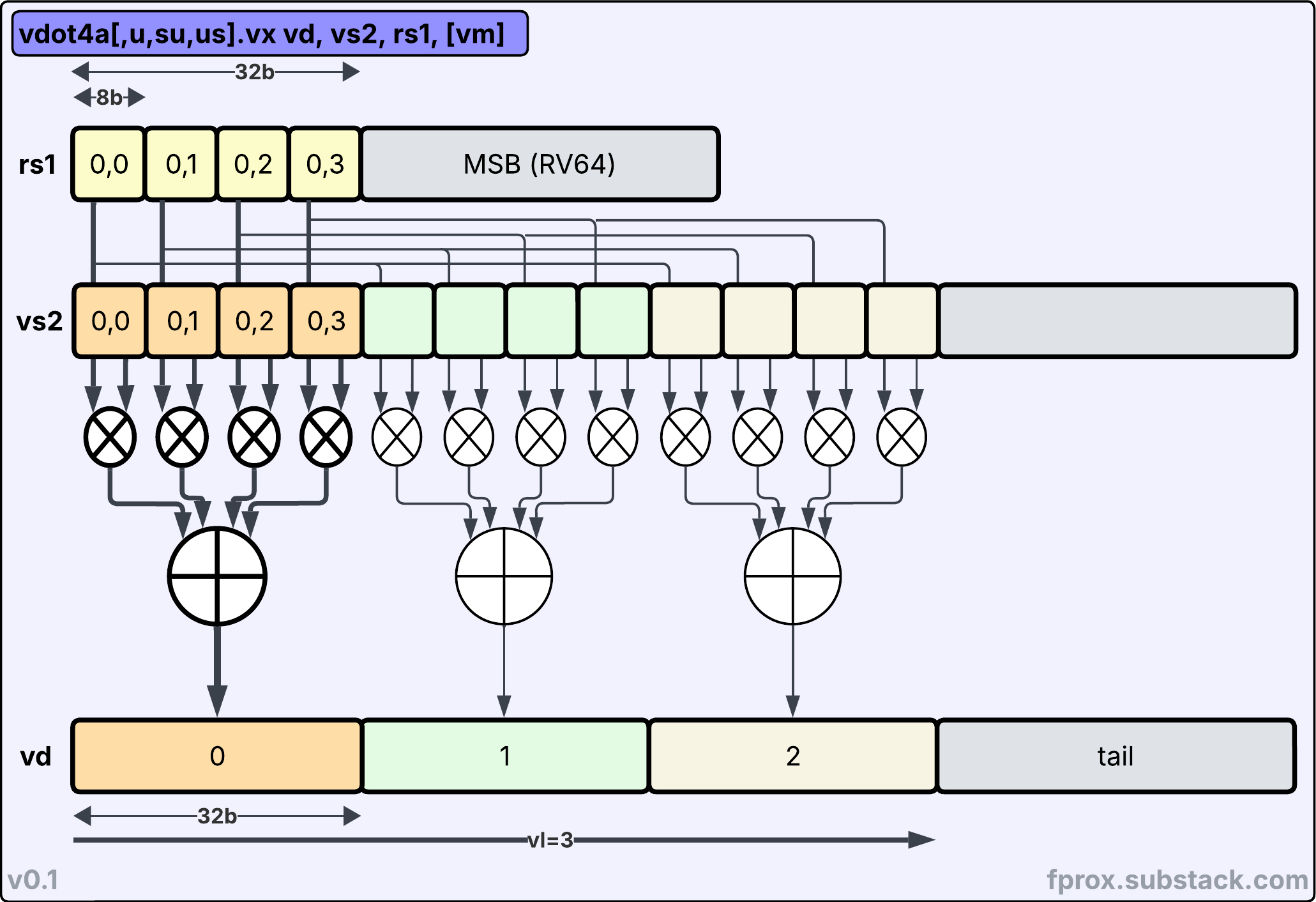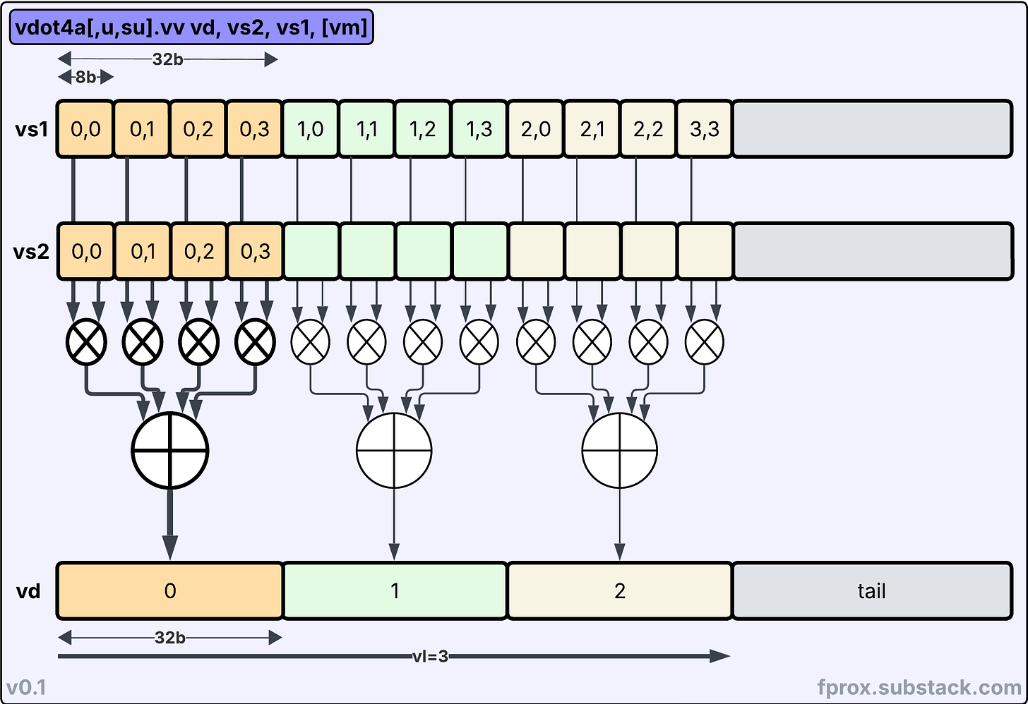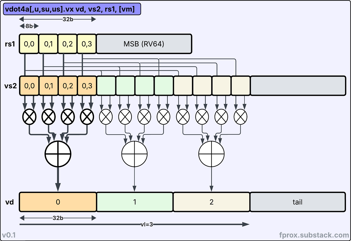 vdot4a.vv(signed-signed),vdot4au.vv(unsigned-unsigned), and,vdot4asu.vv(signed-unsigned)4 vector-scalar instructions: