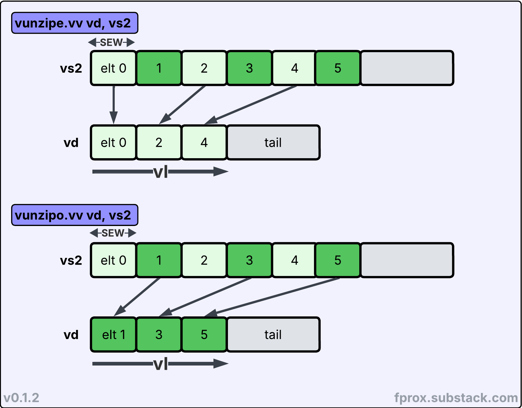 Then, the reciprocals: vunzipe.vv and vunzipo.vv, which extract the even (respectively odd) elements of a vector and group then into the destination vector register group. Mirroring vzip.vv, vunzip[e,o] can access up to 2*vl elements from its source, and the source vs2 EMUL is 2*LMUL