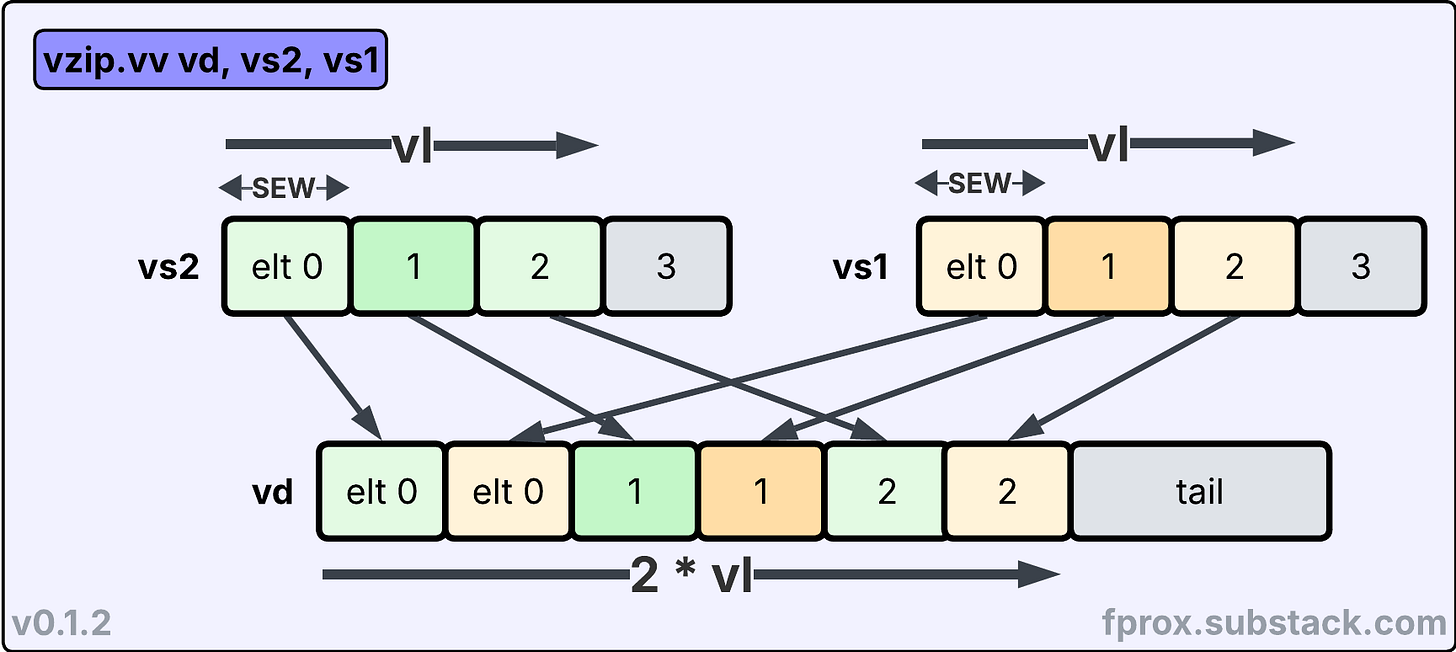 First vzip.vv which combines two input vector register group by interleaving their elements. The operation operates with an effective vector length equals to 2*vl, and the destination vd EMUL is 2*LMUL.