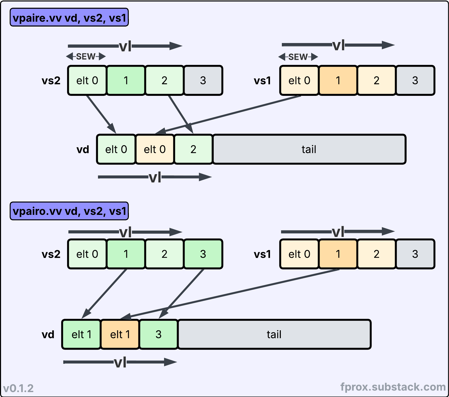 vpairo.vvhas a corner case, whenvlis odd, it is possible that the instruction reads an element beyond theVLMAXmask limit of thevs2vector register group. In that case, the specification mandates that the element is replaced by the value 0.