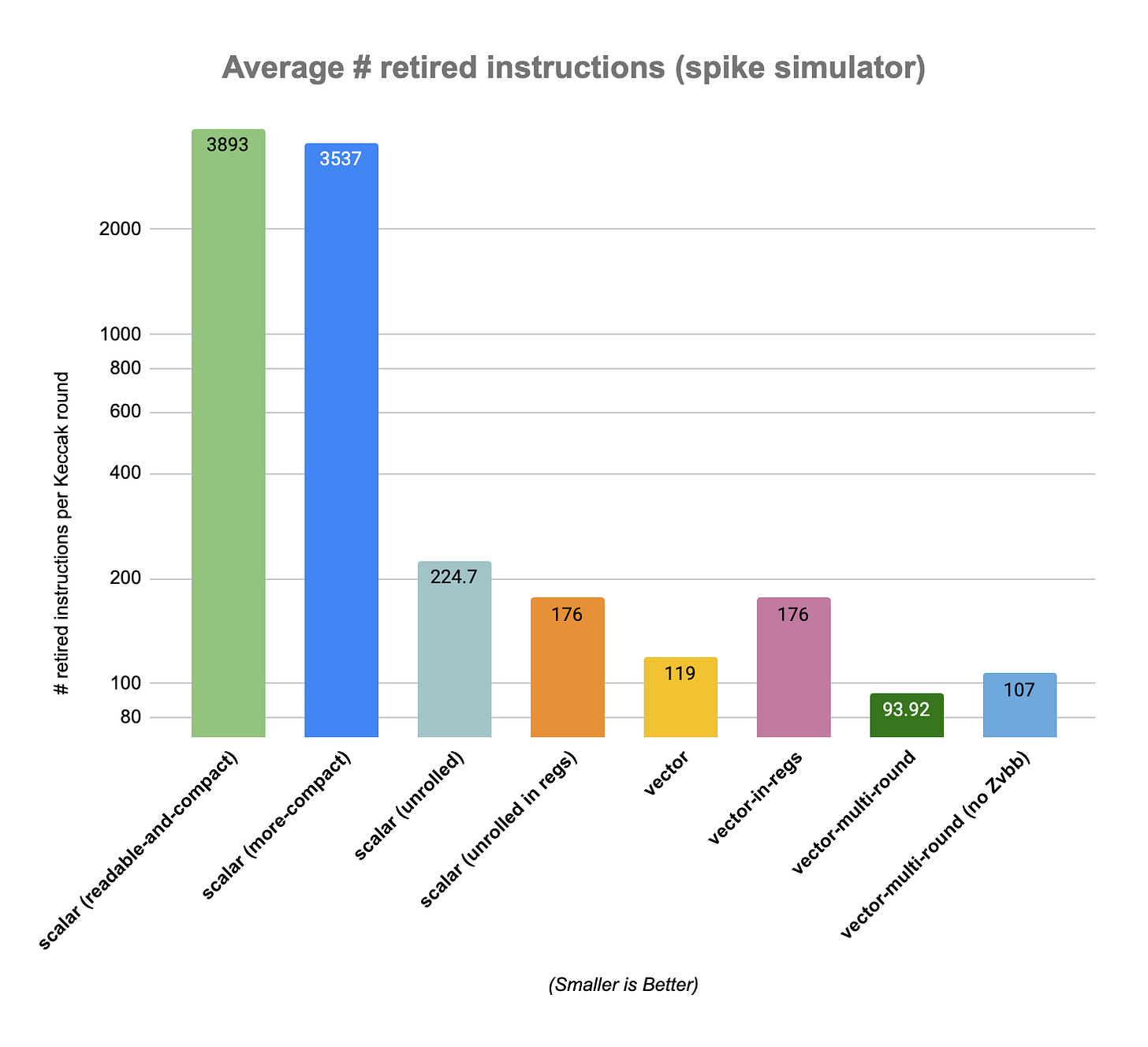 "\x5d\x81\x7b"); /* SHA3-224 */Note: we also benchmarked a multi-round vectorized version without enabling Zvbb, the vector basic bit manipulation extensions. This version requires about 14% more instructions to perform a Keccak round than the version with Zvbb enabled (107 retired instructions per round versus 94).