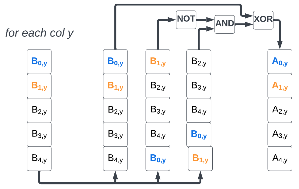 The χ step is made of 25 XOR, 25 NOT, and 25 AND operations. For each element, the operation inputs the current element, the next column element and the next-next column elements.