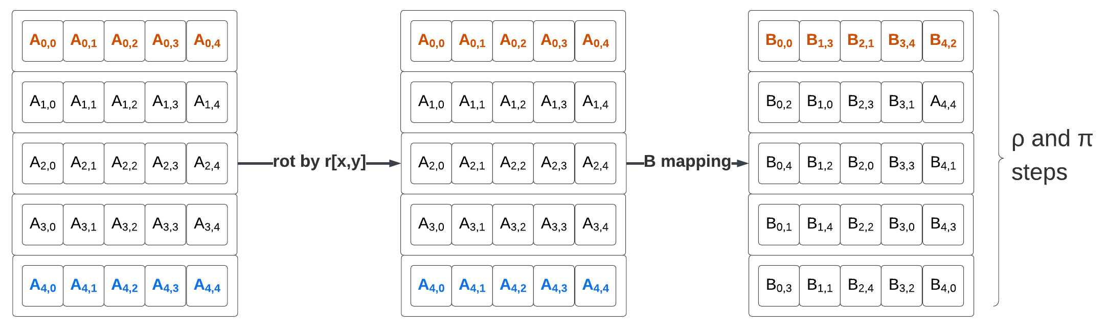 ρ and π steps are built from a permutation from matrix A to matrix B and bit rotations for each element of B (with non-uniform rotation amounts).