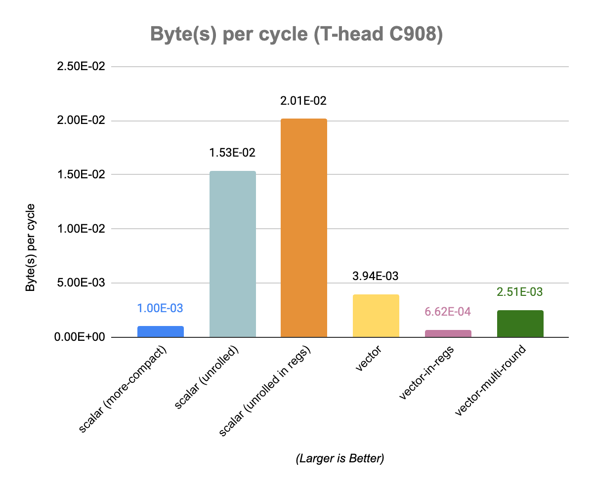 Actual benchmarks on a hardware platform (T-Head C908) done by Camel Coder reveal abysmal performance for the vector implementations (more details here). As expected the number of retired instructions does not convert into a similar behavior when it comes to the actual execution latency. The best scalar implementation, unrolled-in-regs, clocks at about 0.02 Byte per cycle, while the best vector implementation, the baseline vector implementation, is about 5 times slower at around 0.004 Byte per cycle (Camel’s full results and analysis can be found on the github issue). The C908 seems to have a limited width vector datapath which makes running vector code on larger element width not really competitive against scalar execution. In addition some of the more complex vector operations used by our implementations exhibit a low throughput.