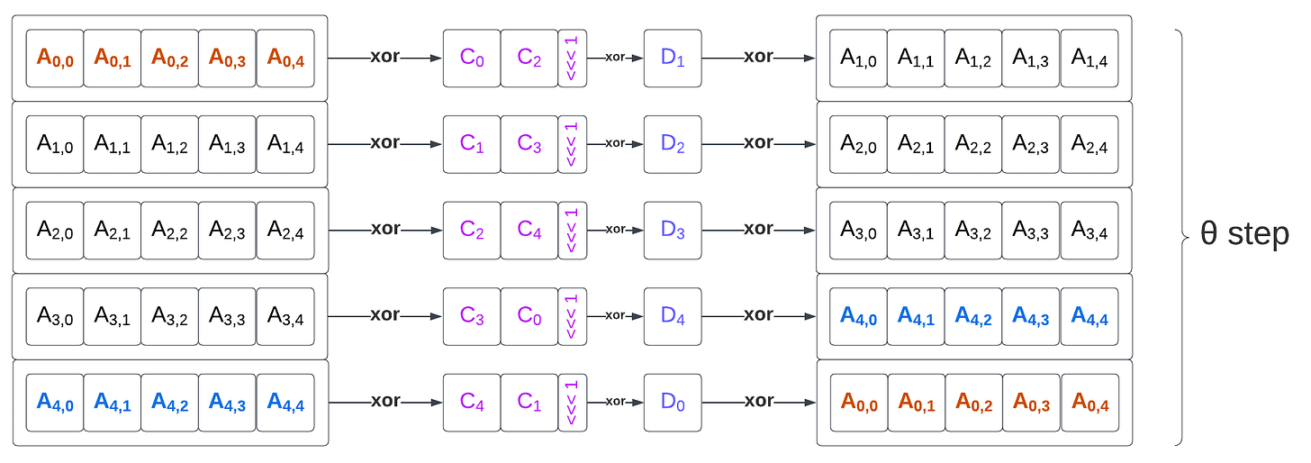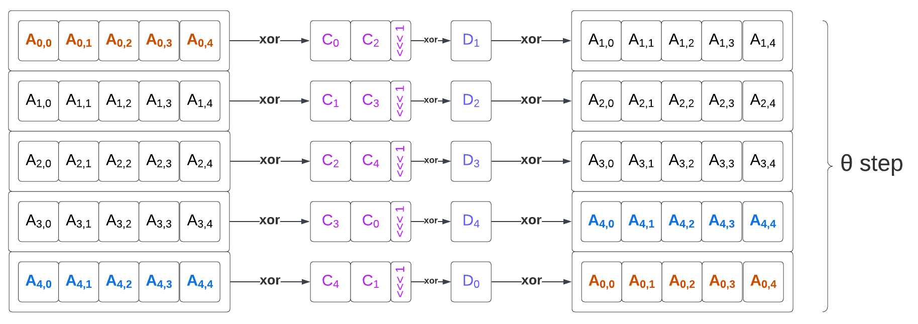 The θ step performs 50 64-bit XOR operations and 5 64-bit left rotation operations (by one bit). The parity C computation exposes some data parallelism (XOR reduction can be evaluated with a binary tree) and XOR-ing D into A exposes 25 independent parallelizable operations.