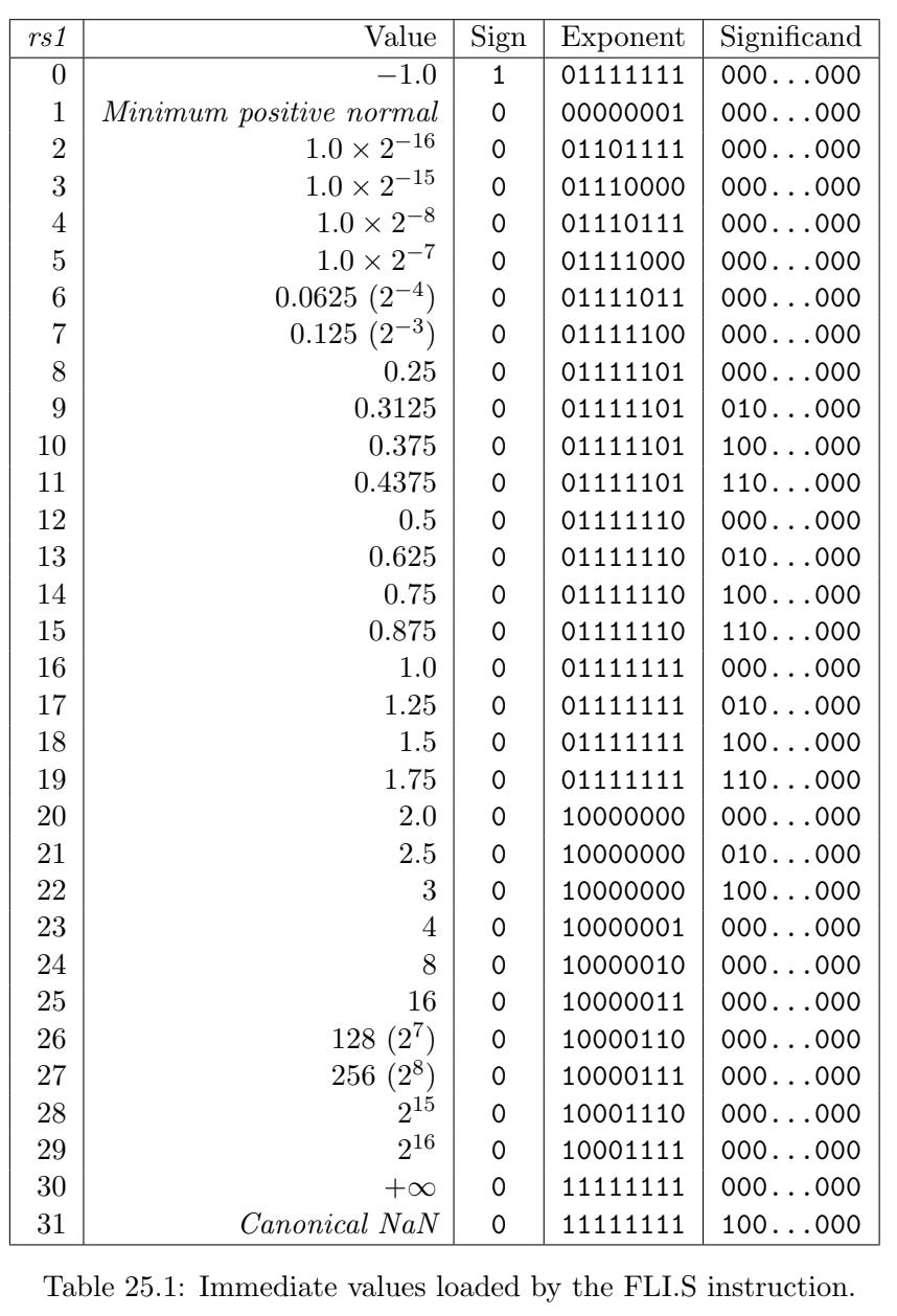 The table (extracted from the standard) listing fli.s possible values has been reproduced above. The constant values were selected as the most frequent values used in a set of libraries and which required few significand bits (at most 2 of the most signicant bits of the mantissa are non-zero), in order to simplify the table implementation.